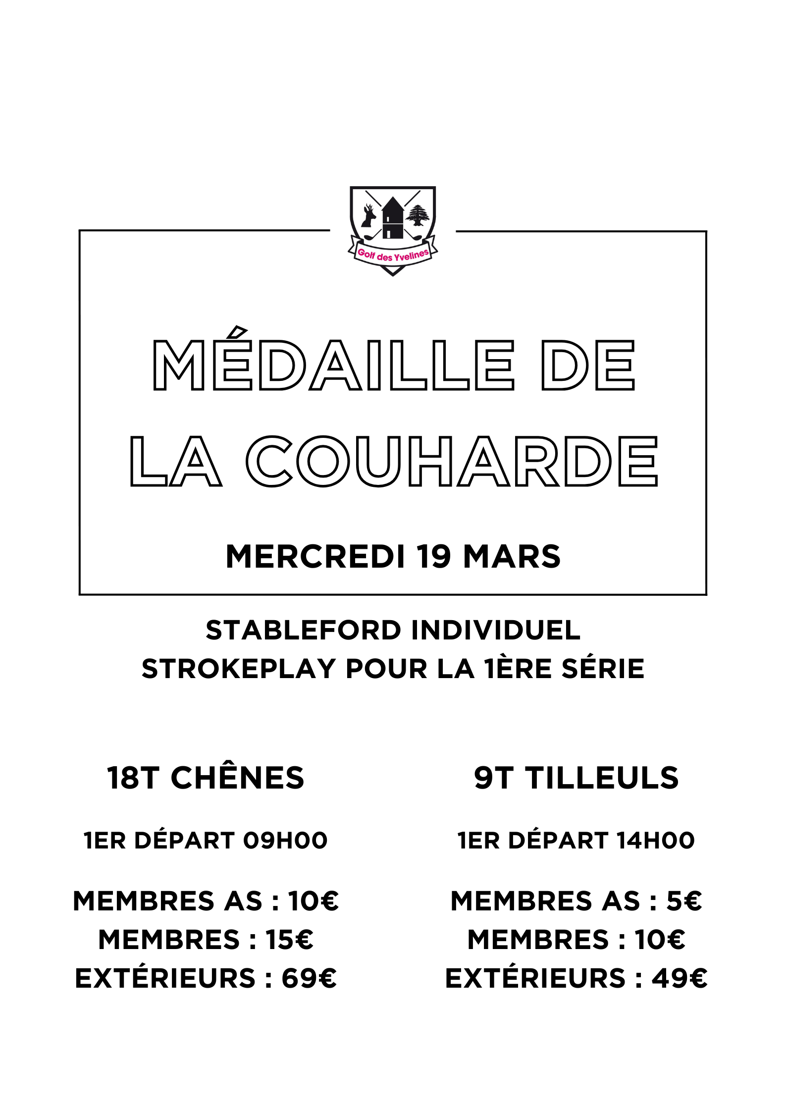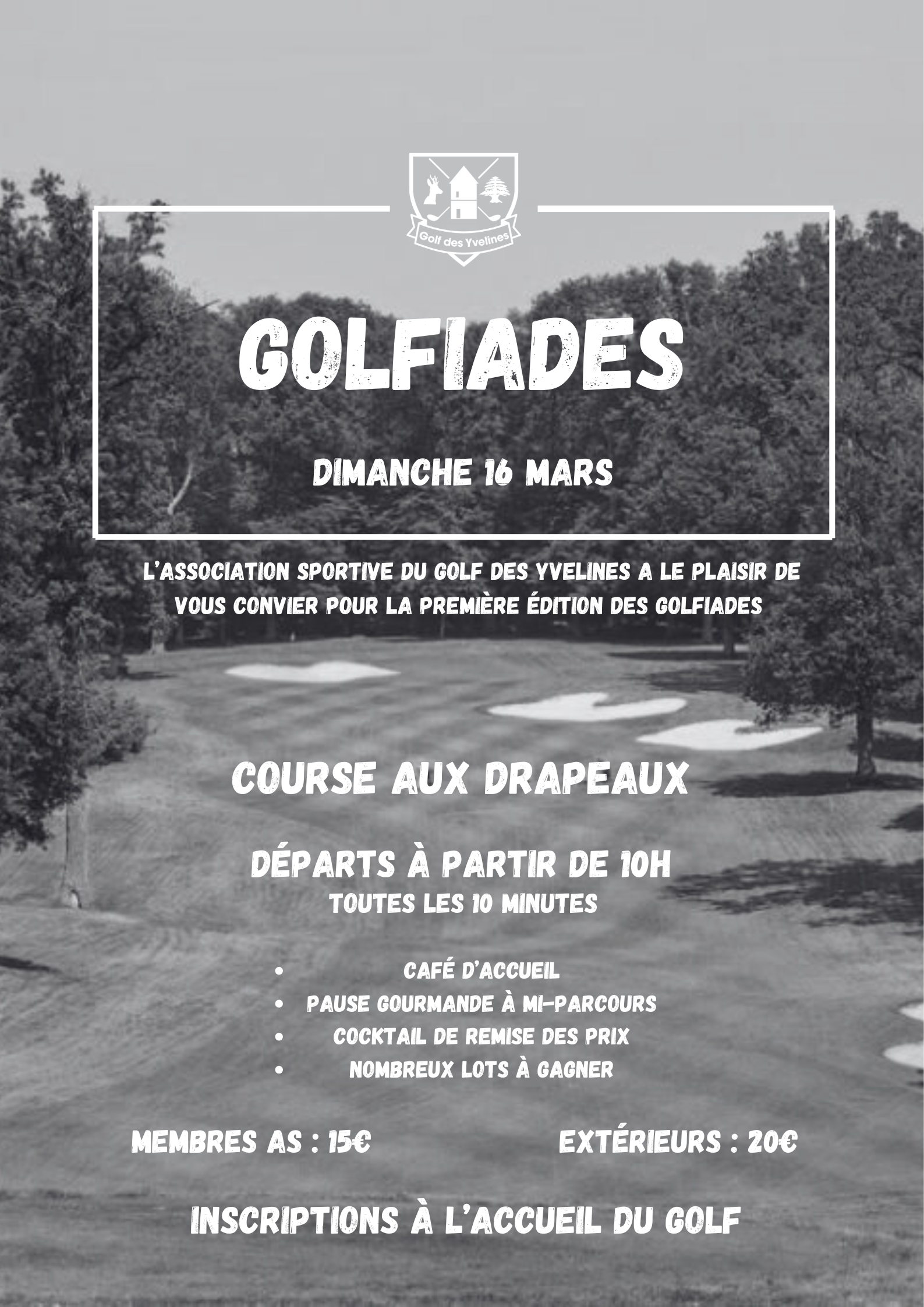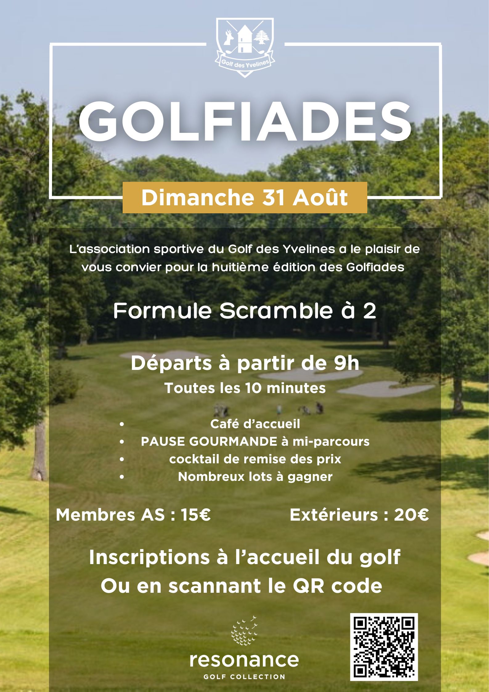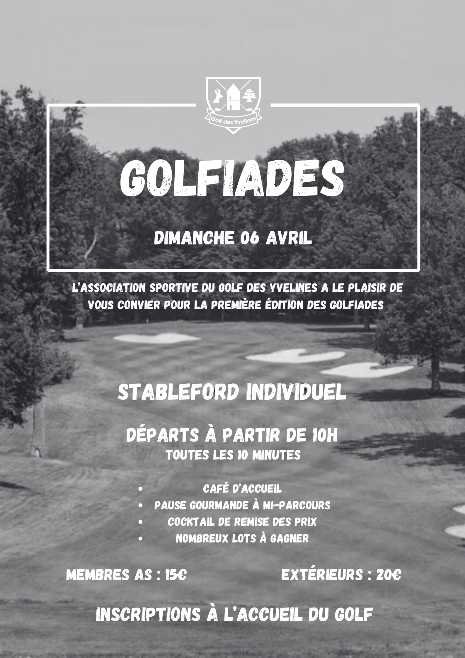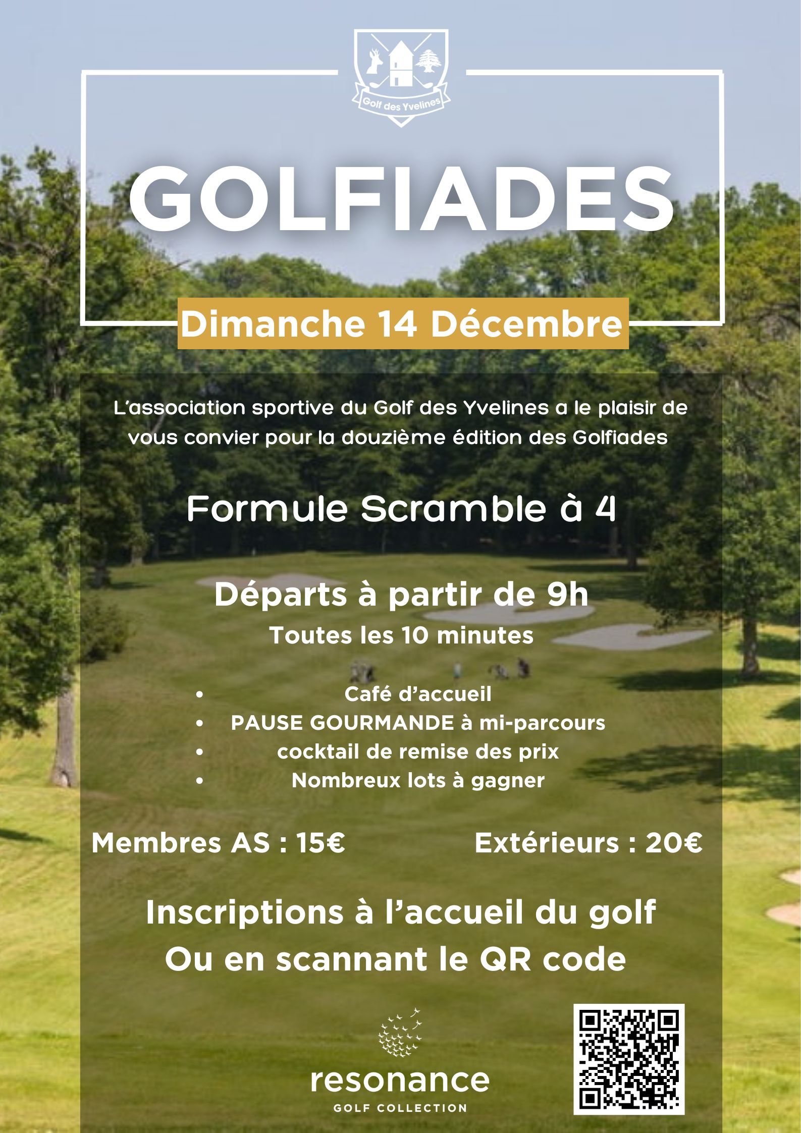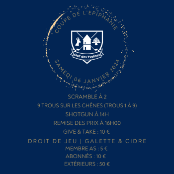 À partir de 14h00, venez participer à une compétition en Scramble à 2 sur le tracé original du Parcours des Chênes. Ce format ludique et accessible à tous les niveaux vous permettra de profiter du parcours tout en partageant un moment de plaisir avec votre partenaire de jeu. Compétition 9 trous également sur le parcours des Tilleuls pour les Handicaps supérieurs à 36.